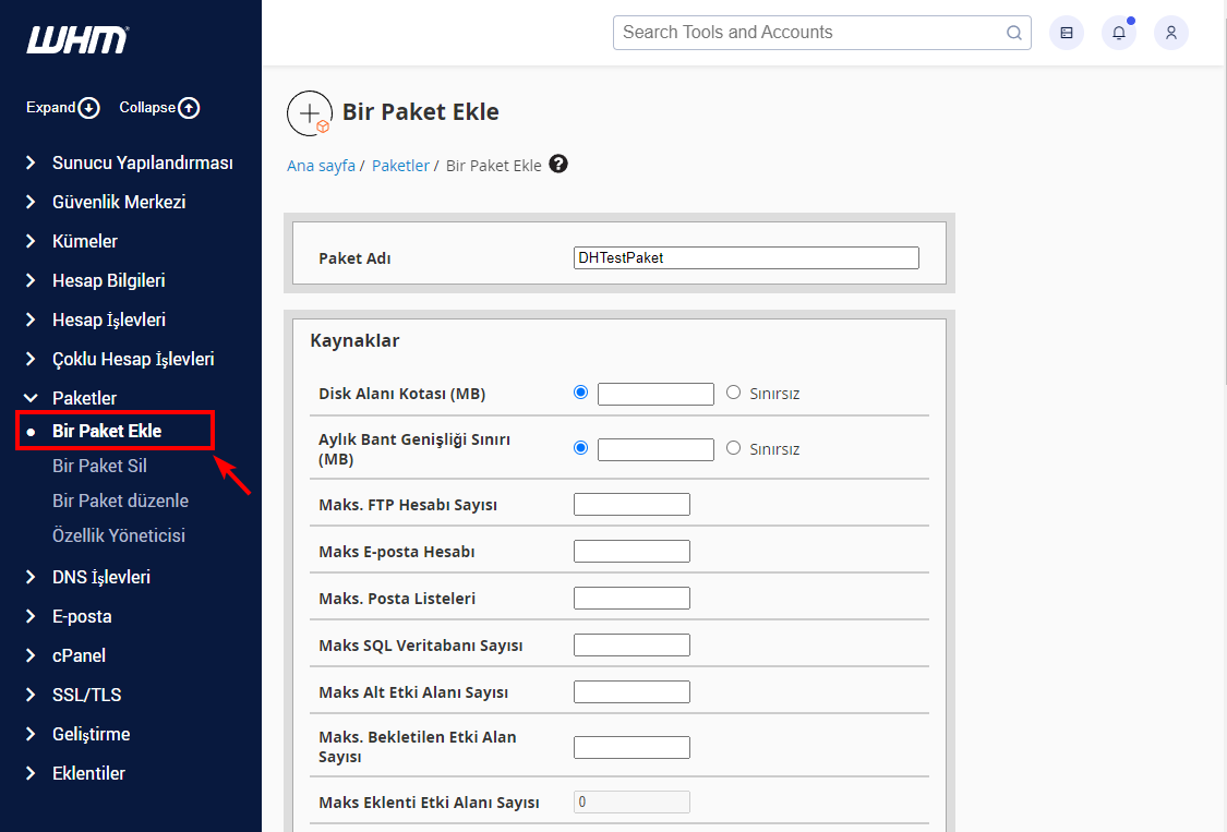 Yapmamız gereken ikinci adım, Bayi Paketimizin içinde Hesapları ekleyeceğimiz paketler oluşturmak. WHM Bayi Paneli içerisinde Paketler bölümünde