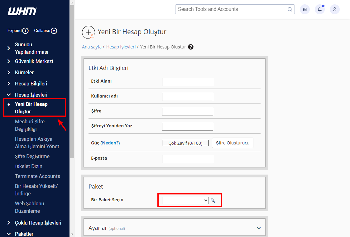 Etki Adı (Domain) vd. bilgileri doldurduktan sonra Paket seçimini yapmayı unutmayın