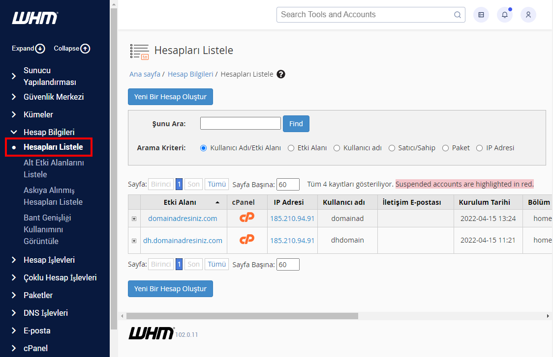 Eklemiş olduğunuz Hesapları yine Bayi Panelinizin içerisinde Hesap Bilgileri bölümünün altında bulunan Hesapları Listele sayfasında görebilirsiniz. CP logosuna tıklayarak her bir hesabın cPanel sayfasına geçebilir ve yönetimini yapabilirsiniz.