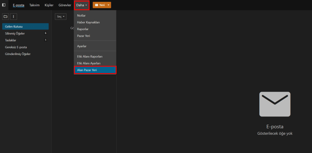 Kurumsal E-mail panelinize yönetici hesabınızla giriş yaptıktan sonra Daha > Alan Pazar Yerine gidin.