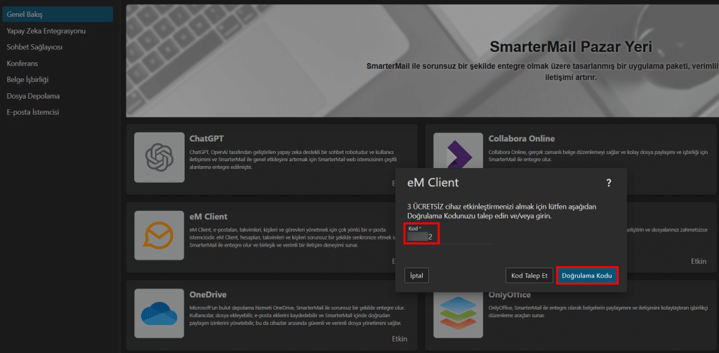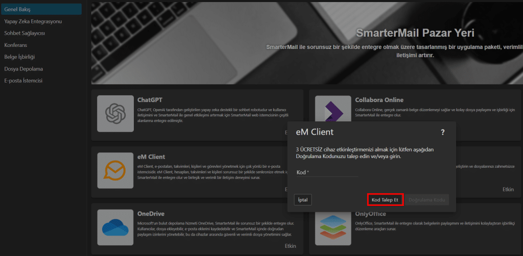 Sayfada bulunan eM Client butonuna tıklayın. Karşınız çıkan ekranda bulunan Kodu Talep Et butonuna tıklayın. Aktifleştirme kodu yönetici hesabınıza mail olarak iletilecektir.