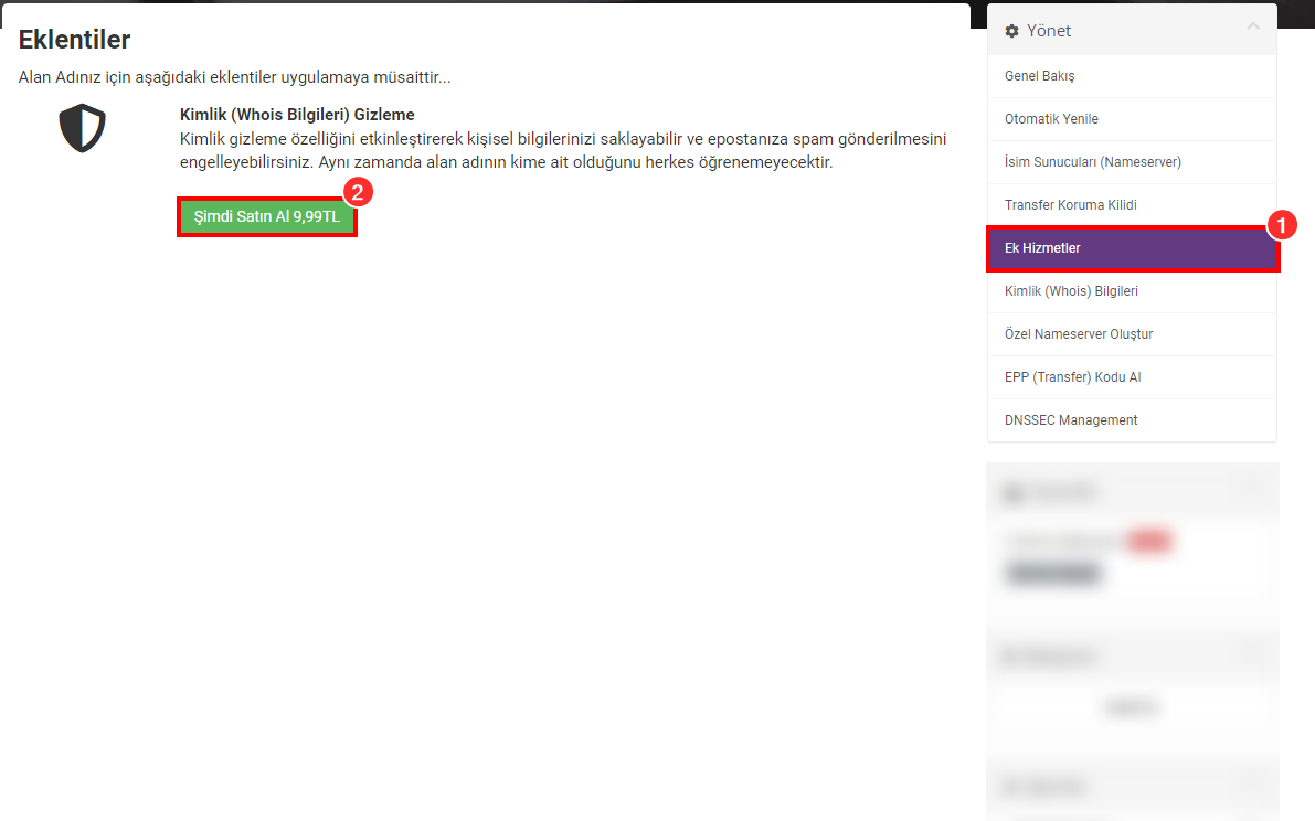 3) Domain Yönetimi sayfasının sağ tarafındaki Yönet menüsü içerisinde yer alan Ek Hizmetler bölümünden Kimlik (WHOIS Bilgileri) Gizleme hizmeti için satın alım yapabilirsiniz.