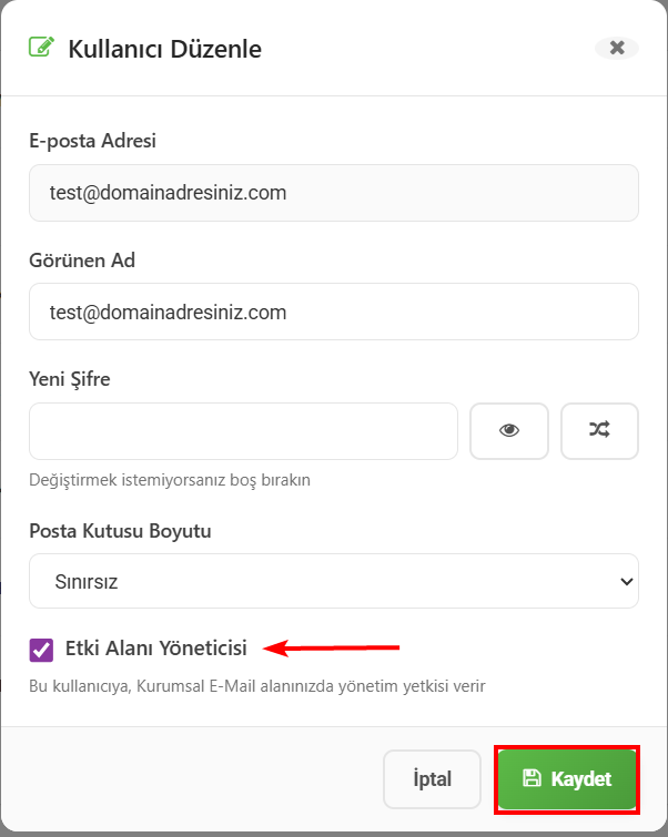 Sonrasında yönetici olarak tanımlamak istediğiniz e-postanın sağ tarafında bulunan Düzenle seçeneğine tıklayıp açılan sayfadan Etki Alanı Yöneticisi seçeneğini aktif ettikten sora Değişiklikleri kaydet butonuna tıklayın.