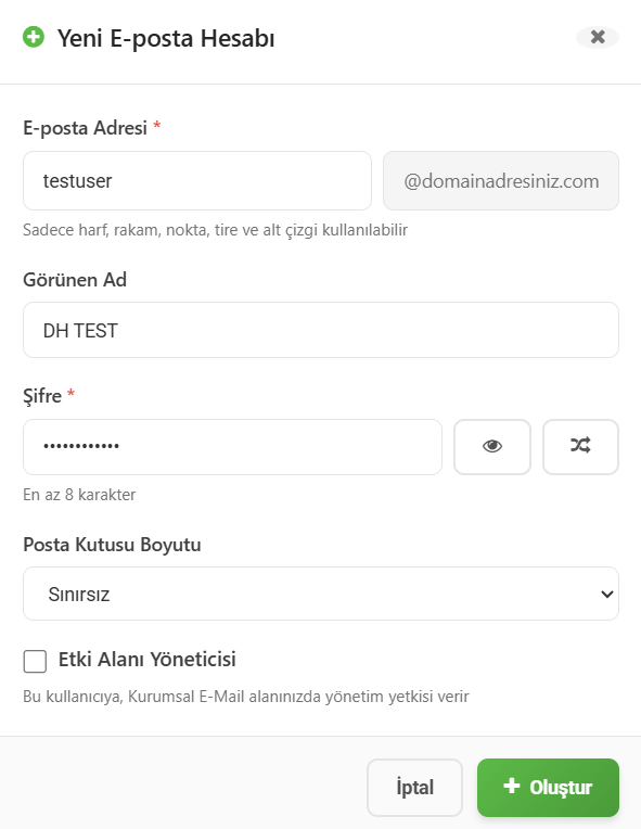 Açılan sayfada oluşturmak istediğiniz hesabın bilgilerini ve kaç MB mail kotası kullanmasını istiyorsanız girerek Oluştur butonuna tıklayın.