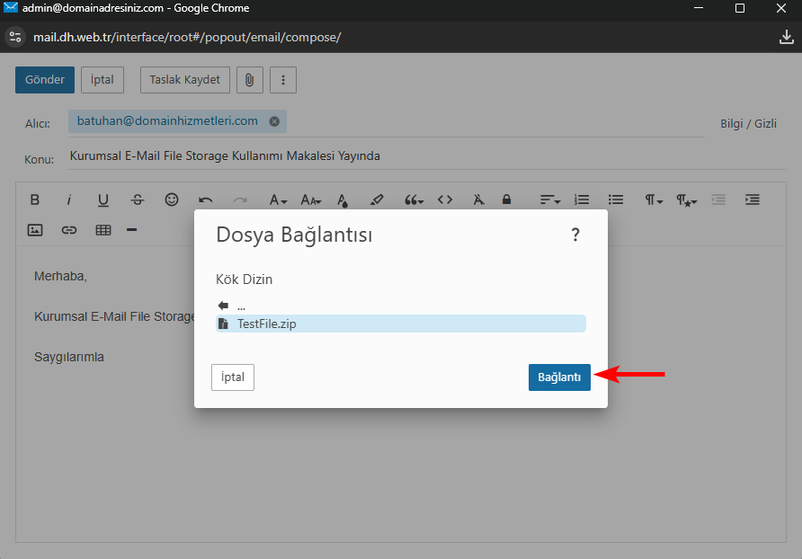 Açılan pencerede ek olarak göndermek istediğiniz dosyanızı seçip Bağlantı seçeneğine tıklayarak ek olarak maillerinize dosyanızı ekleyebilirsiniz.