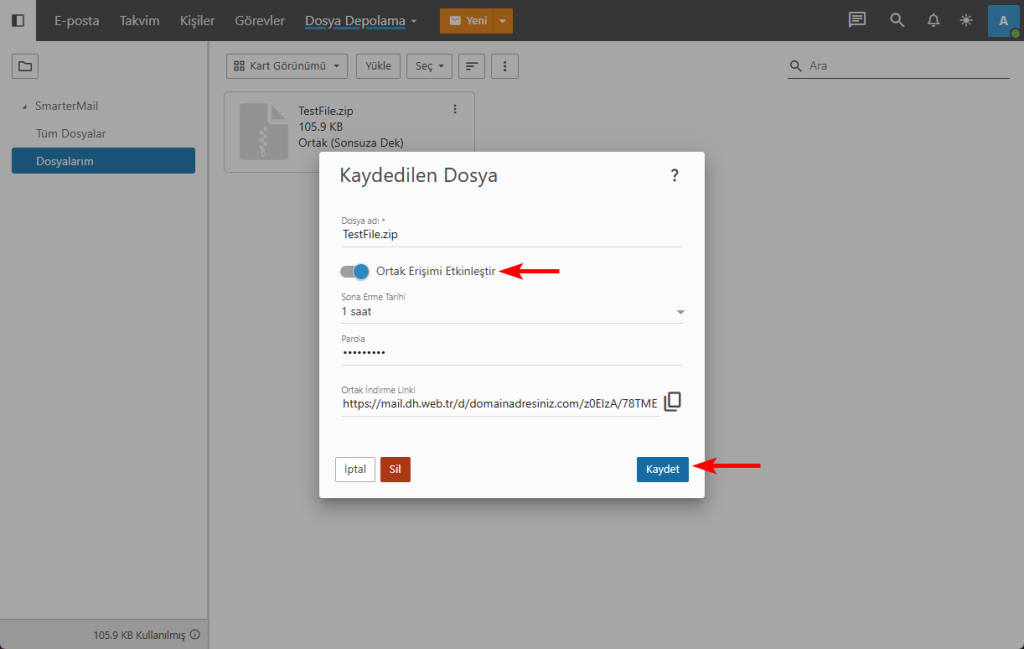 Dosya üzerine tıklayın ve “Ortak Erişimi Etkinleştir” seçeneğini aktif edin. Paylaşım linkinize şifre koyabilirsiniz. Linkin geçerlilik süresini belirleyebilirsiniz. Ayarları yaptıktan sonra Kaydet butonuna tıklayın ve linkinizi oluşturun.
