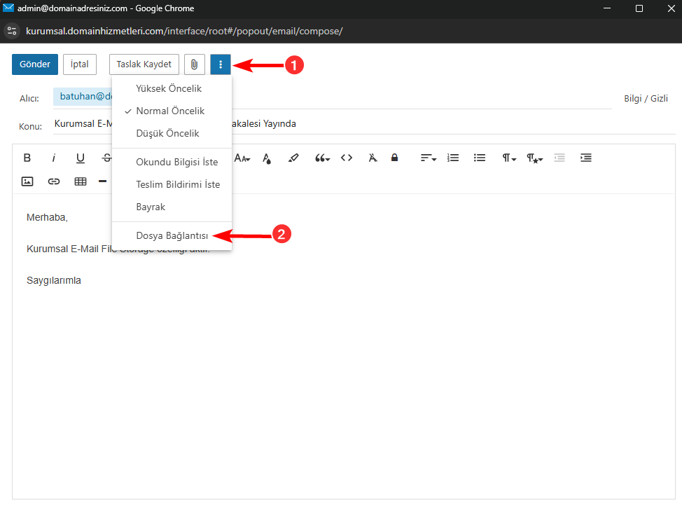 Maillerinize dosyalarınızı ek olarak eklemek için Eylemler seçeneği üzerinden Dosya Bağlantısı seçiniz.