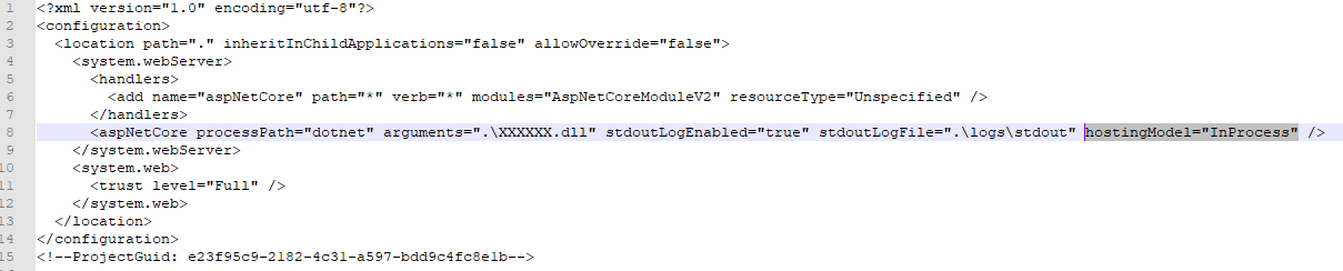 <aspNetCore processPath="dotnet" arguments=".\XXXXXX.dll" stdoutLogEnabled="false" stdoutLogFile=".\logs\stdout"/>